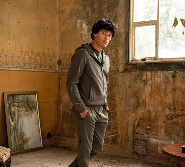 Het omkeerbare techpak in marinebruin.
