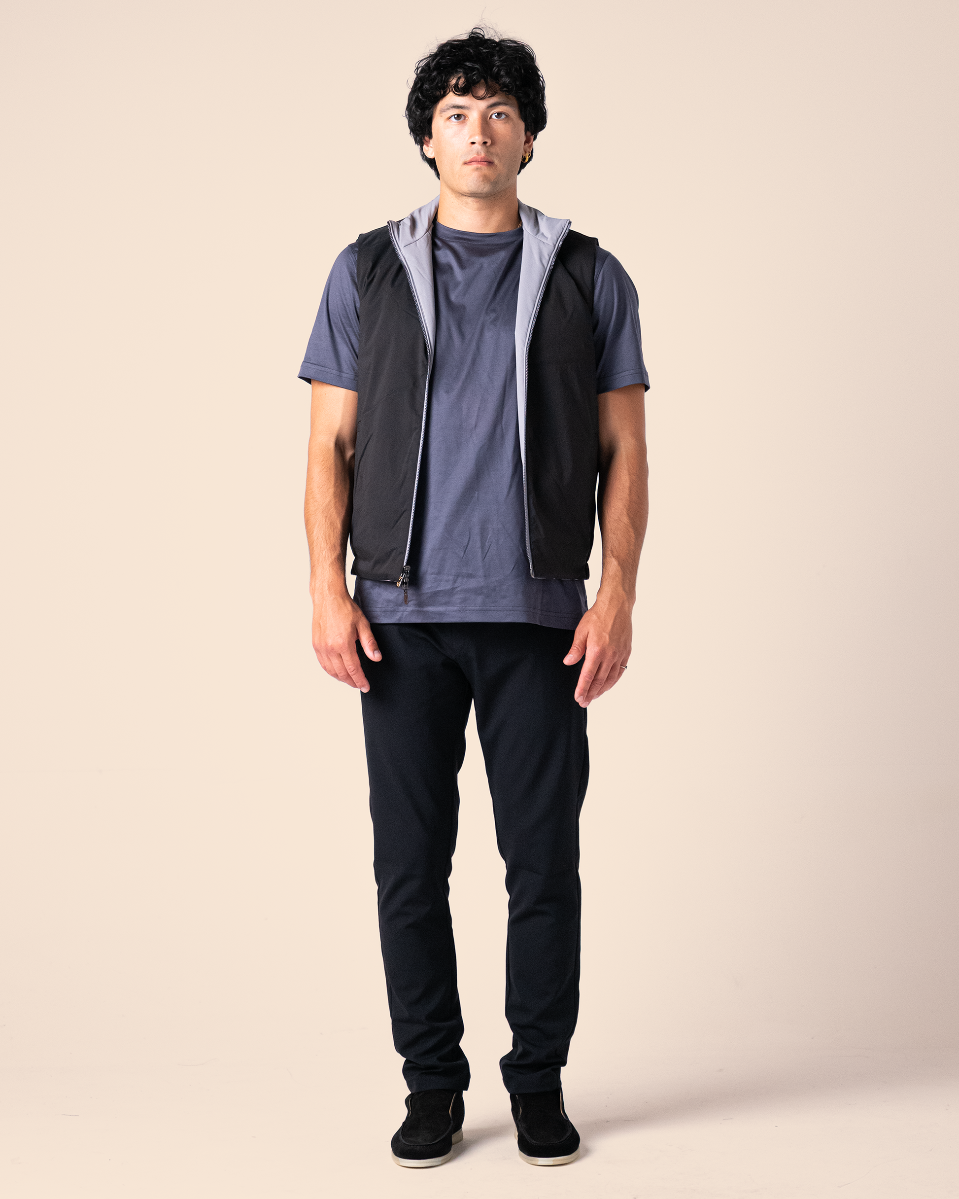 The Pirloni reversible bodywarmer, crafted from lightweight, premium nylon, offers style and luxury. Slightly filled with lightweight Dupont cotton for an elegant touch. The bodywarmer features high-quality metal zippers hidden behind expertly stitched seams. The color combination beige and dark brown evokes Mediterranean luxury, blending sophistication and timeless style with unmatched attention to detail. The branded zippers complete the design, adding a final touch of sophistication and style.