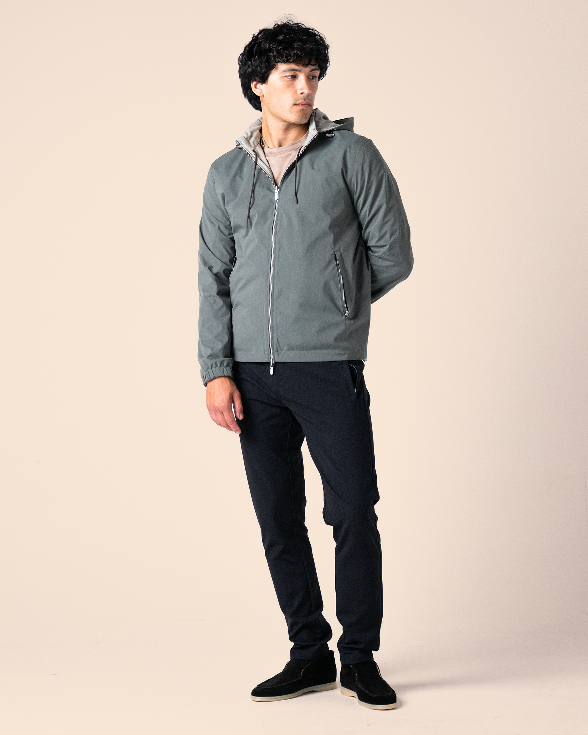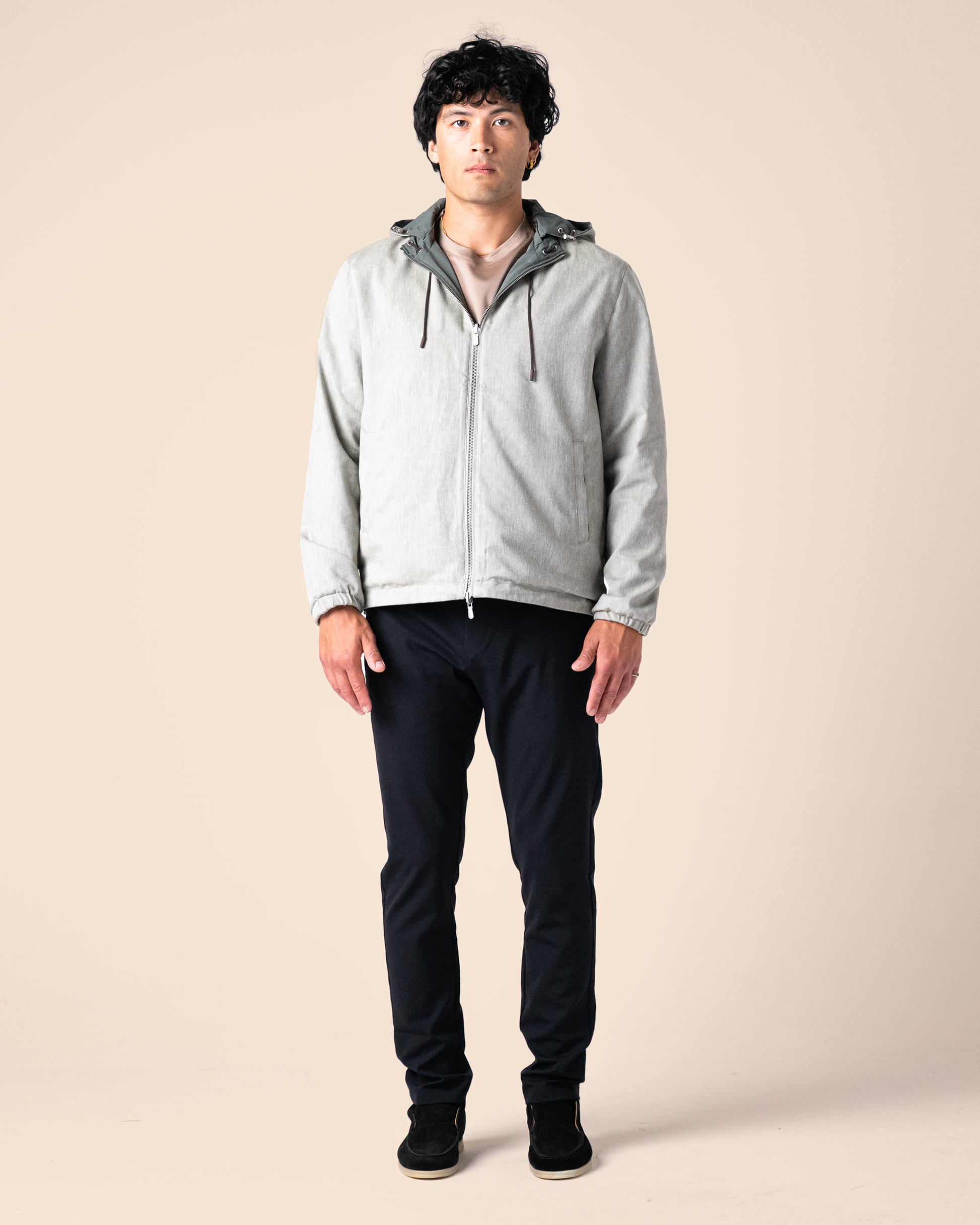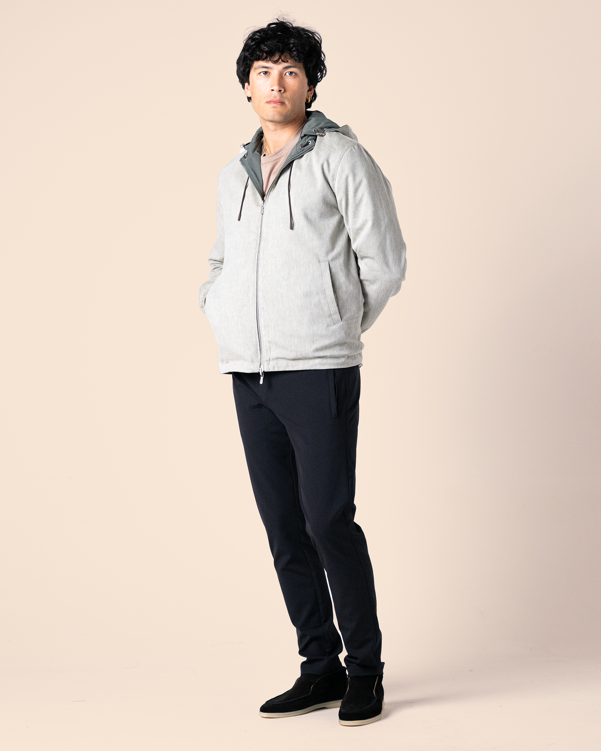 This reversible jacket features one side crafted from premium nylon and the other from breathable linen, offering both durability and comfort. Designed for versatility, it includes a detachable hood, allowing you to adapt to changing weather. Finished with branded zippers, this functional piece combines sleek design with Mediterranean craftsmanship for a stylish, practical outerwear solution.