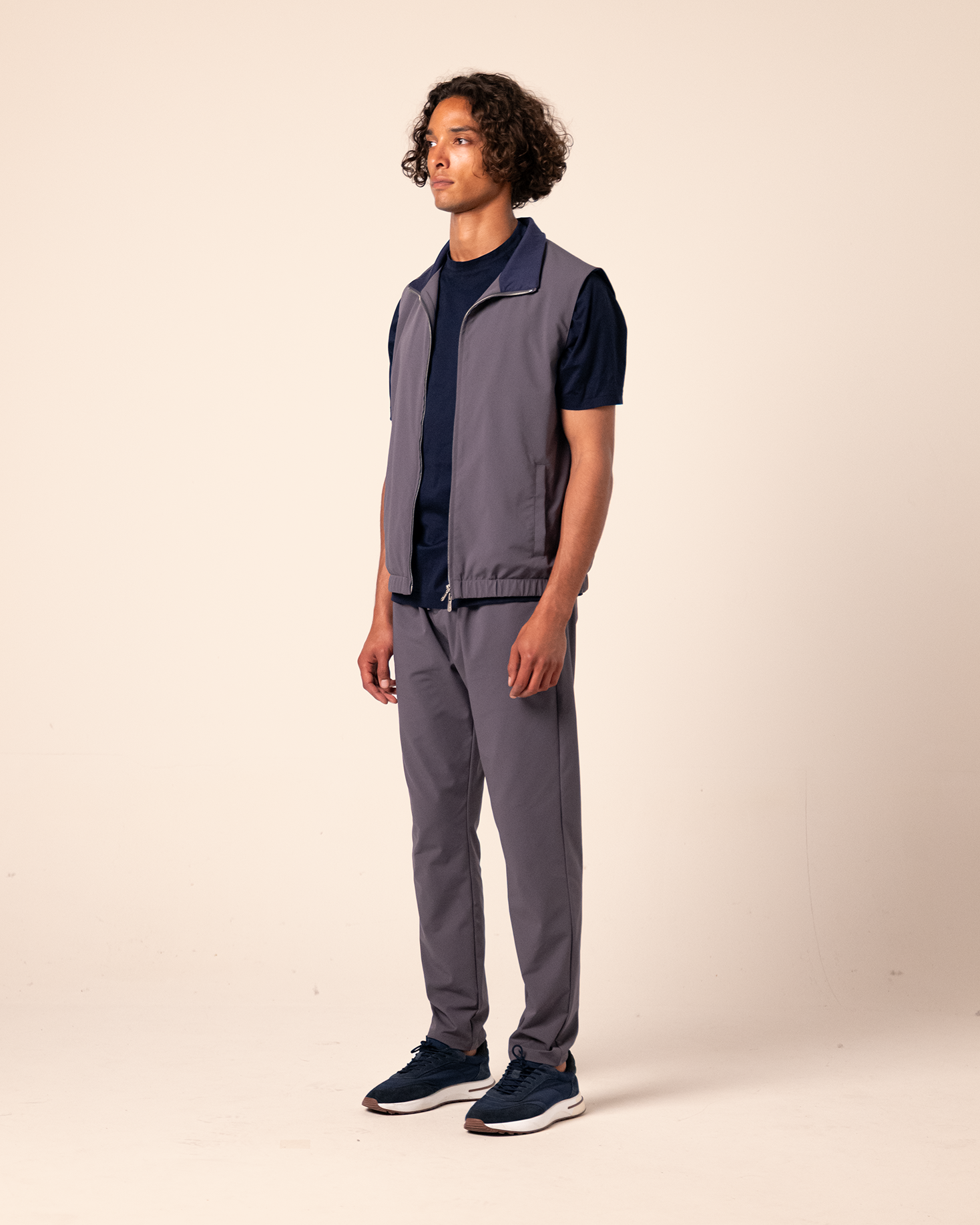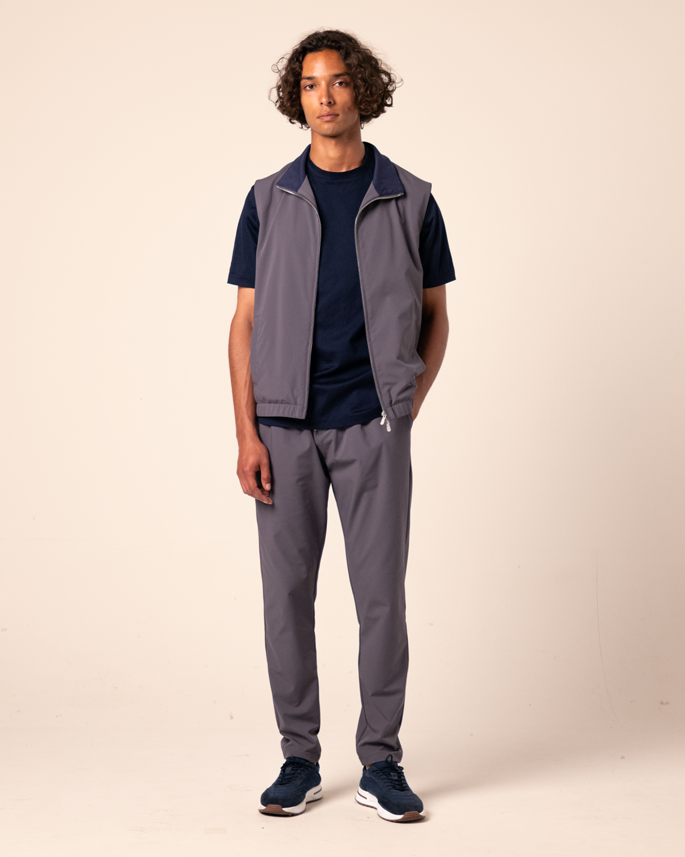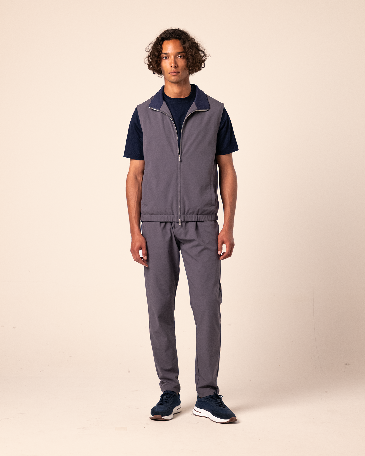 This lightweight technical bodywarmer set, paired with matching trousers, is ideal for warmer days. Designed for breathability and comfort, the bodywarmer features sleek dark accents in the collar, adding a touch of contrast to its minimalist design. The trousers offer flexibility and freedom of movement, combining high-performance materials with style for ultimate comfort in the heat.