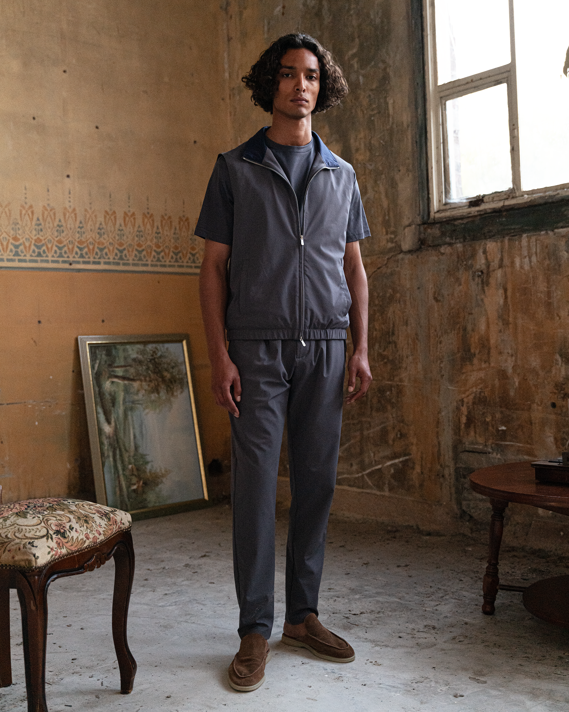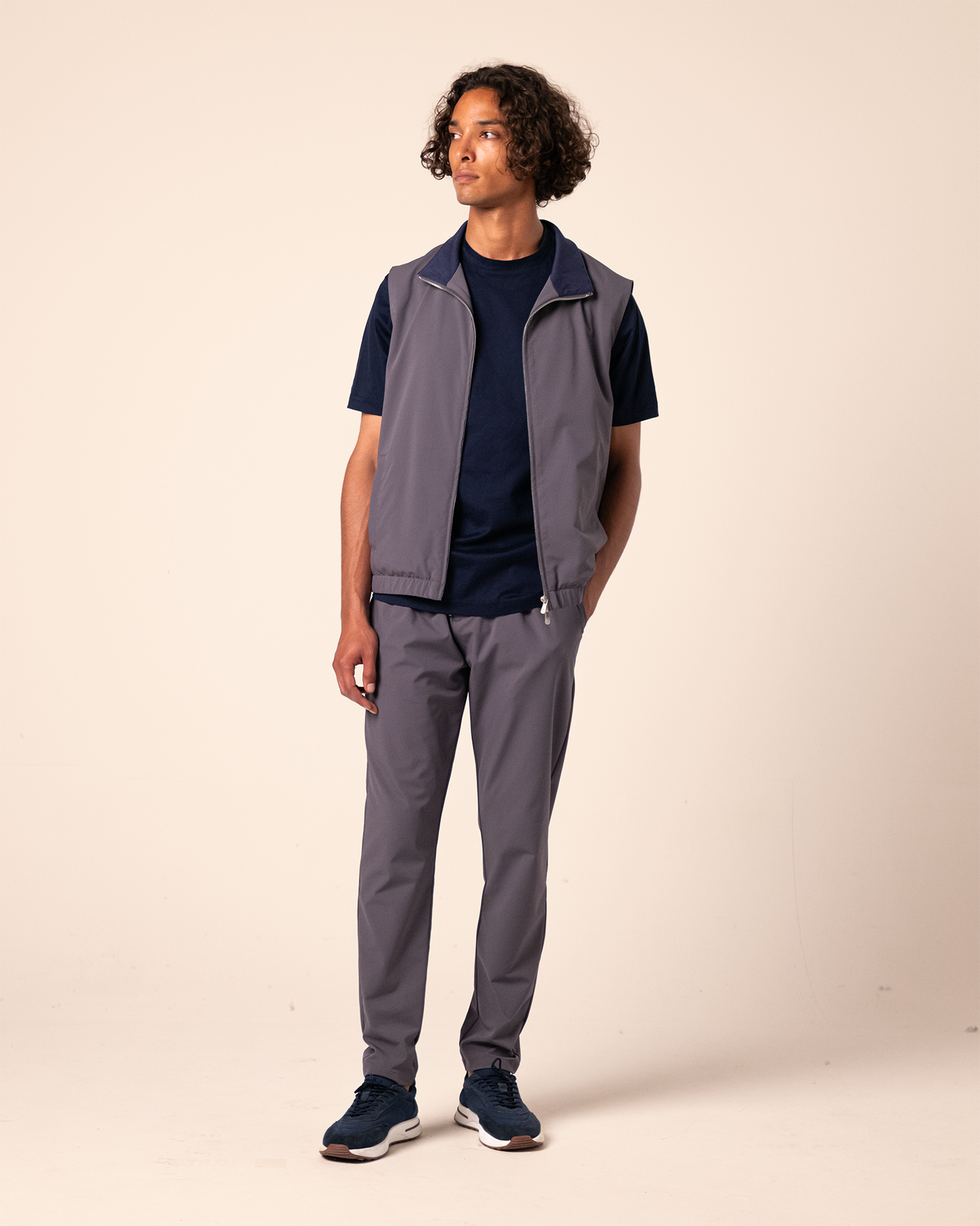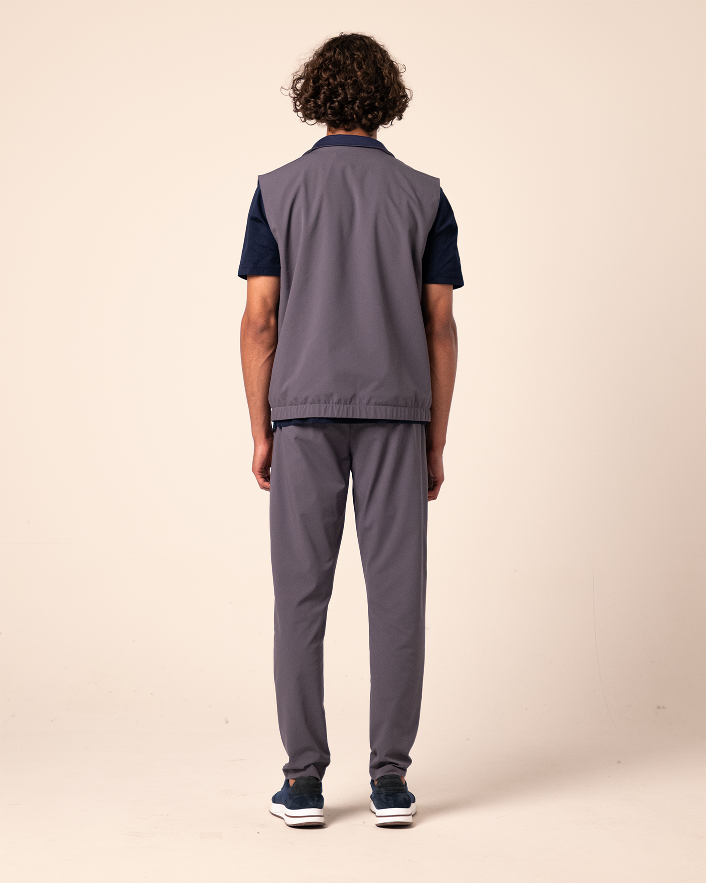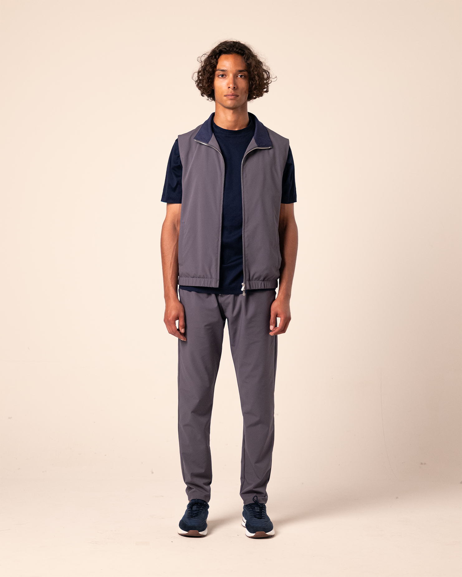 This lightweight technical bodywarmer set, paired with matching trousers, is ideal for warmer days. Designed for breathability and comfort, the bodywarmer features sleek dark accents in the collar, adding a touch of contrast to its minimalist design. The trousers offer flexibility and freedom of movement, combining high-performance materials with style for ultimate comfort in the heat.